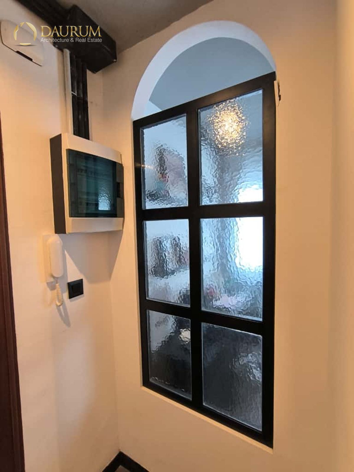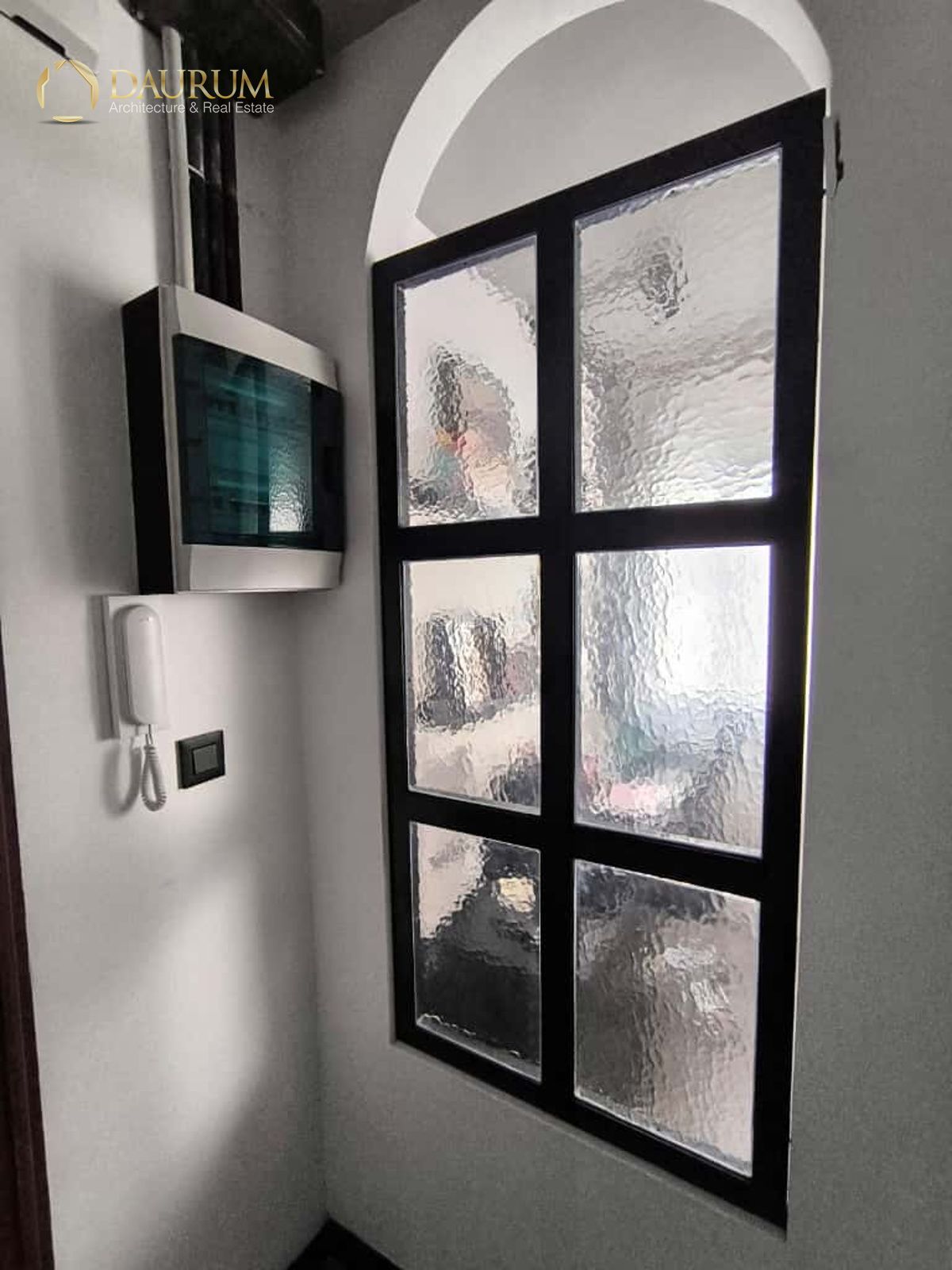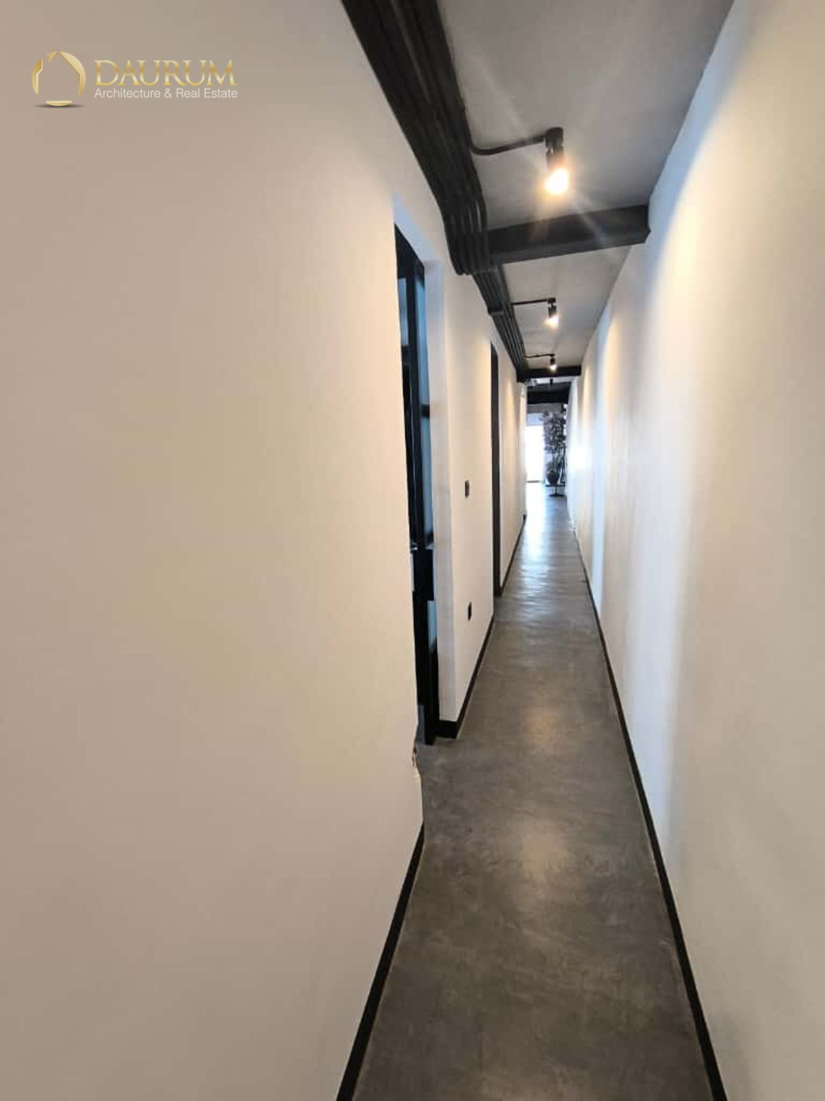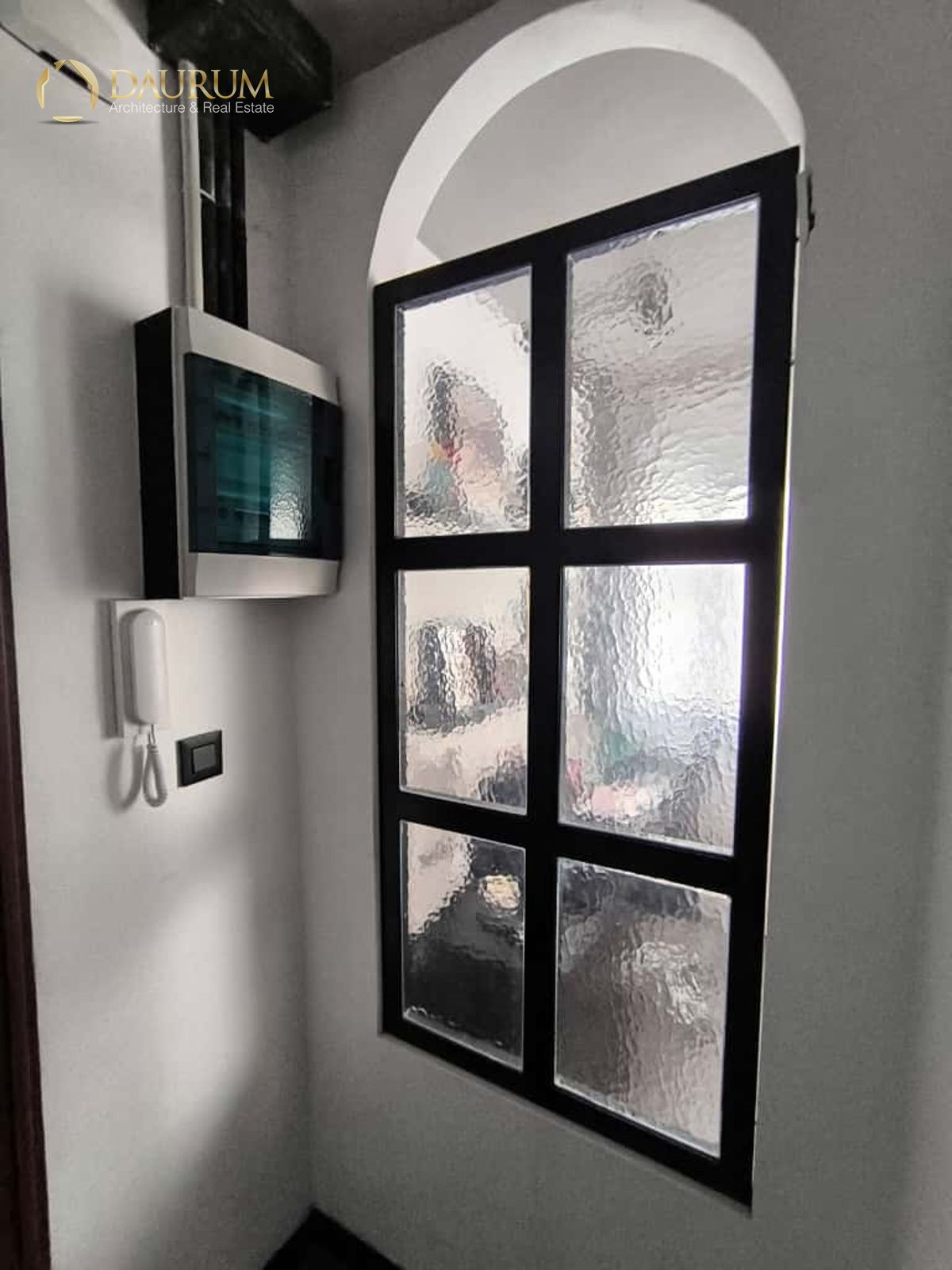 Ventanas de aluminio negro climalit, puertas correderas de hierro, suelo de microcemento y pintura lisa, blanca.
