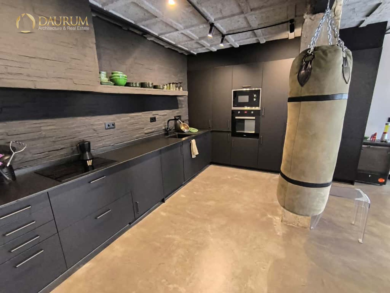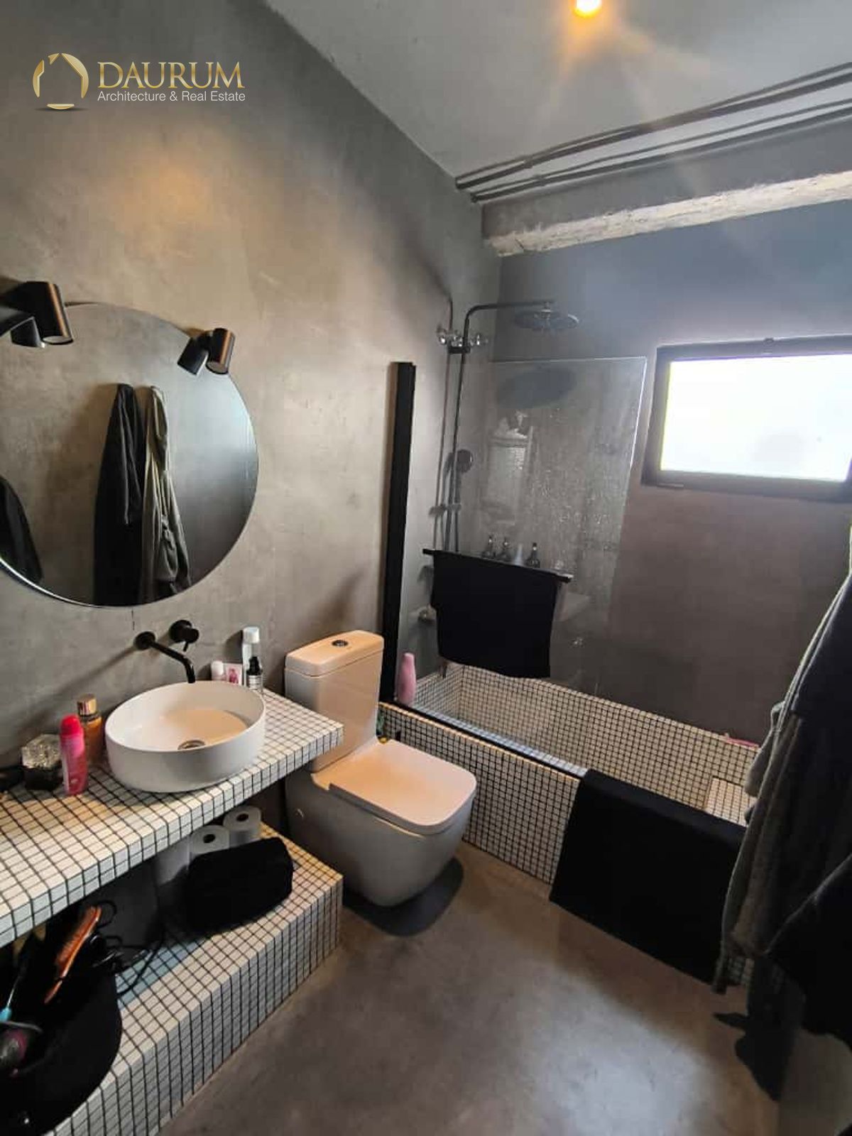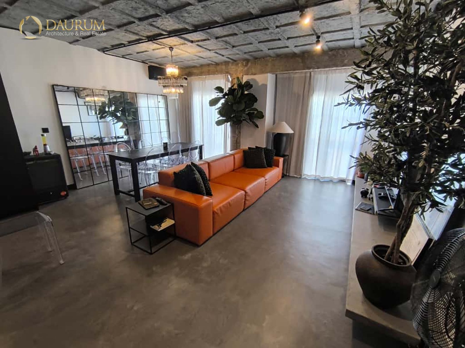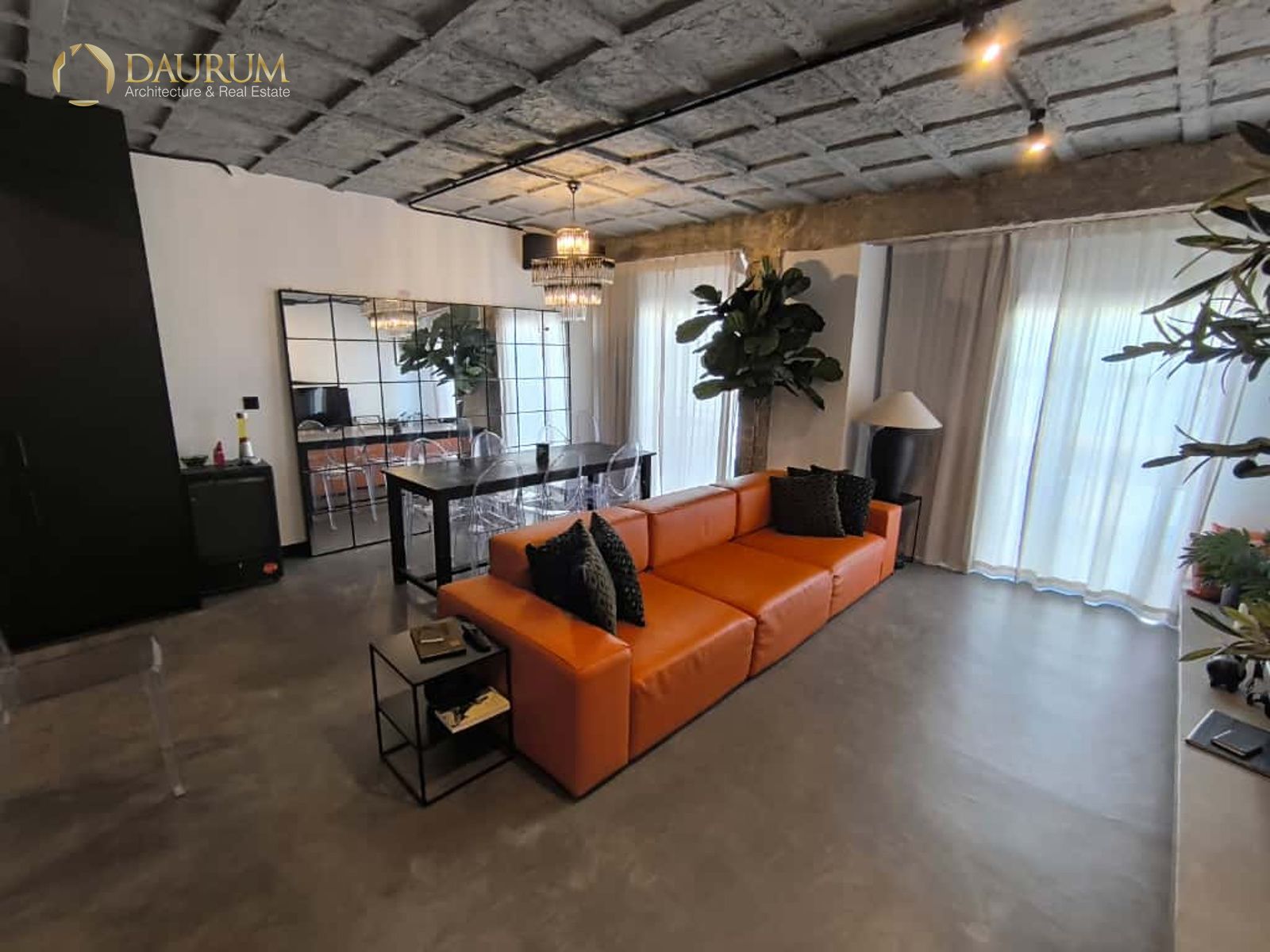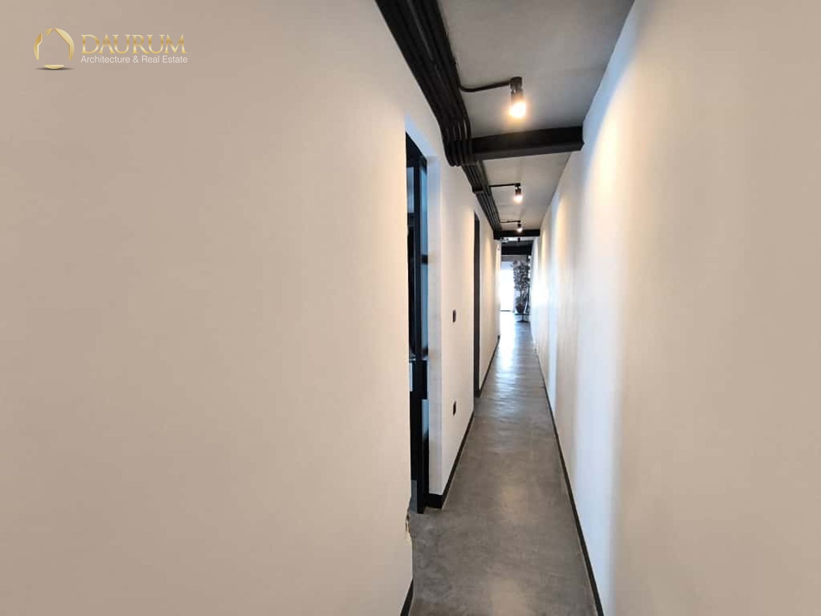 Ventanas de aluminio negro climalit, puertas correderas de hierro, suelo de microcemento y pintura lisa, blanca.
