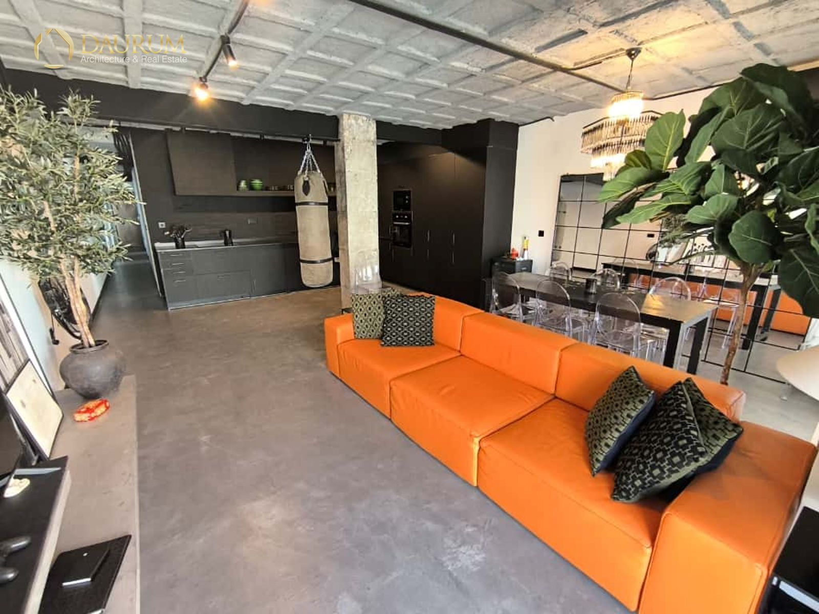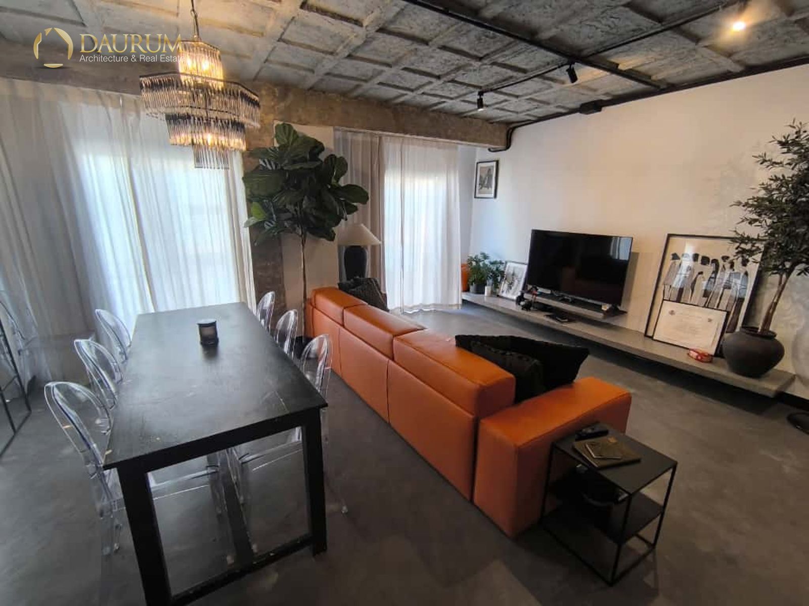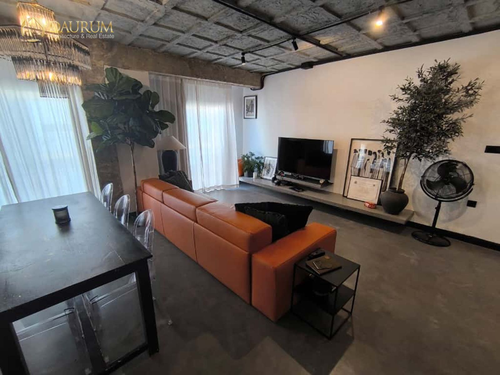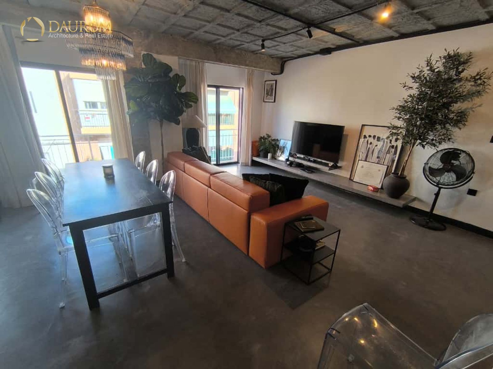 Ventanas de aluminio negro climalit, puertas correderas de hierro, suelo de microcemento y pintura lisa, blanca.