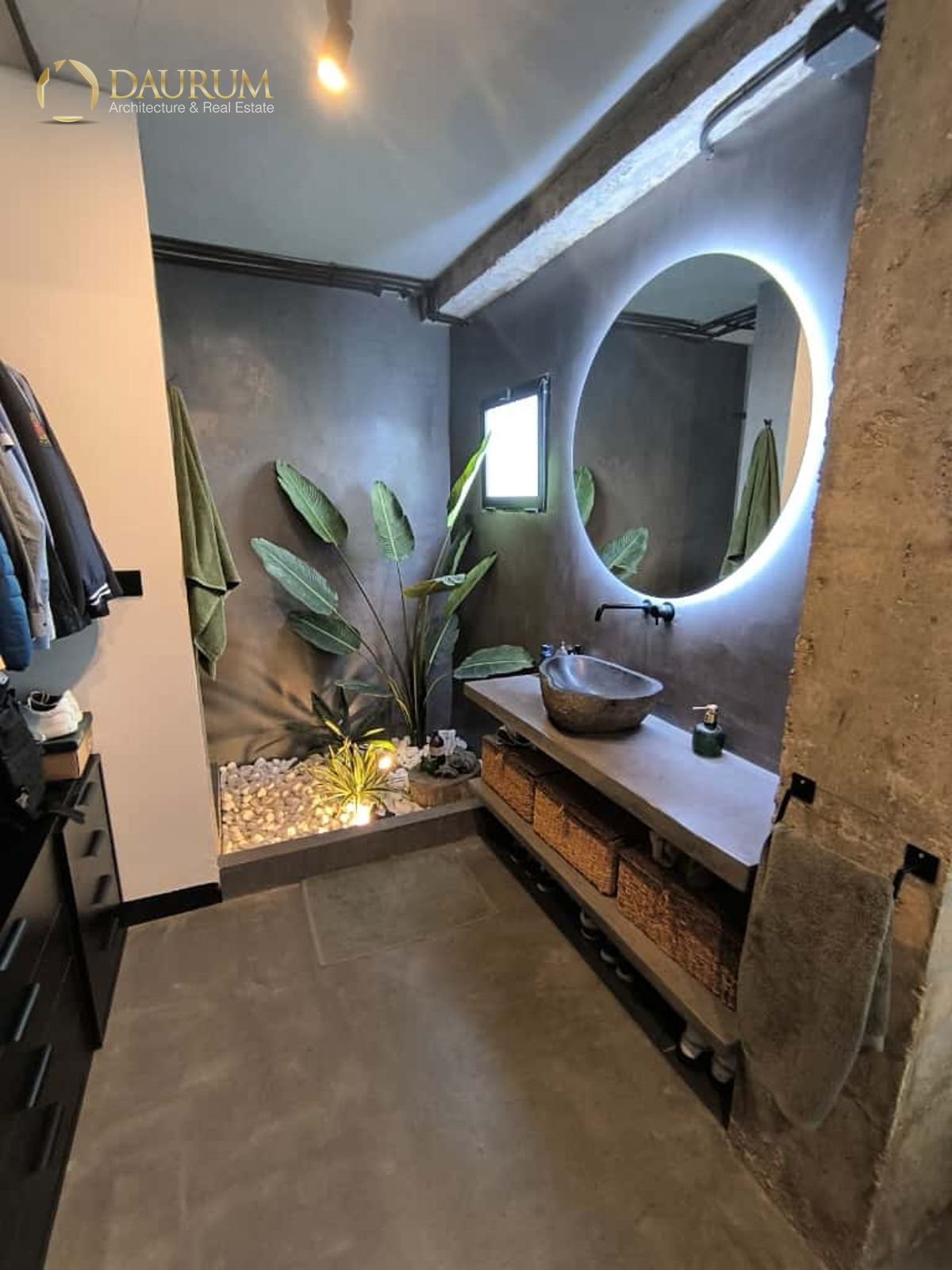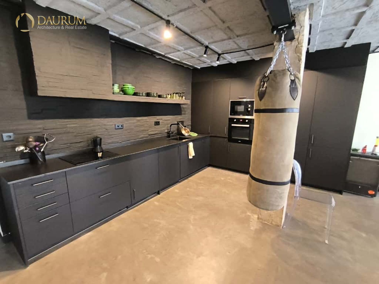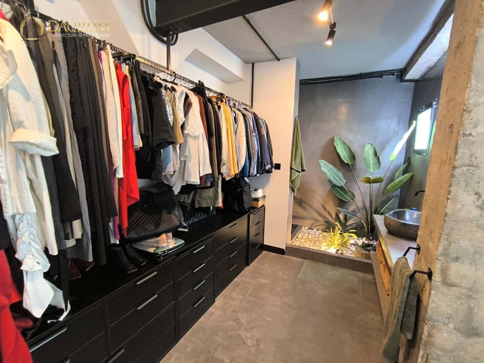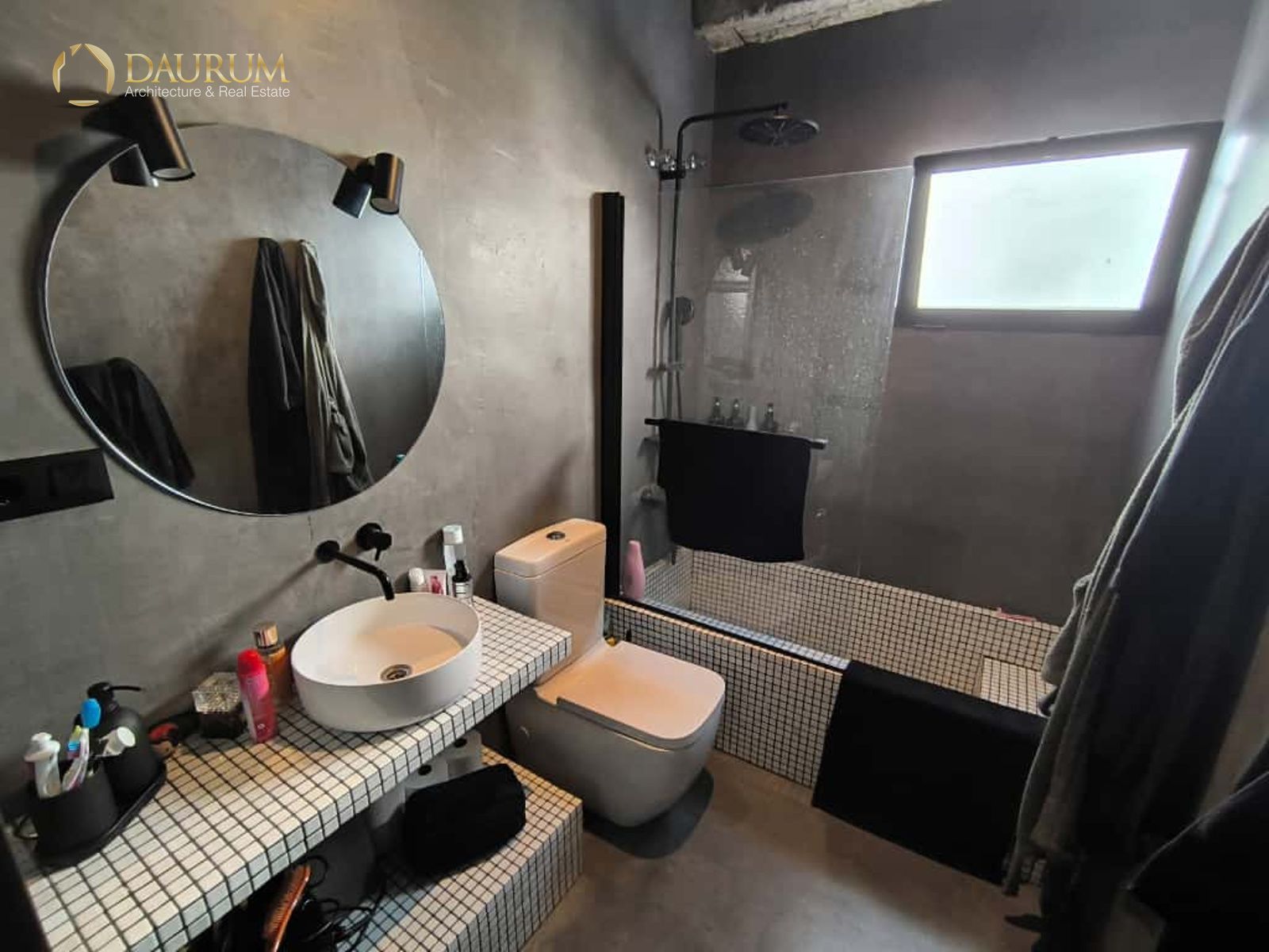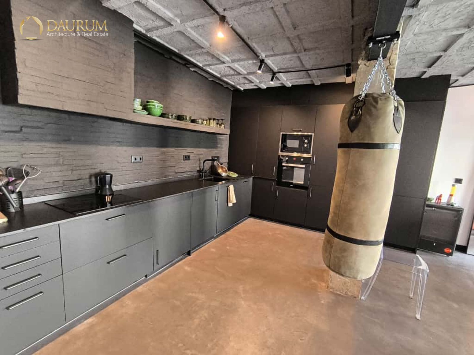 Ventanas de aluminio negro climalit, puertas correderas de hierro, suelo de microcemento y pintura lisa, blanca.