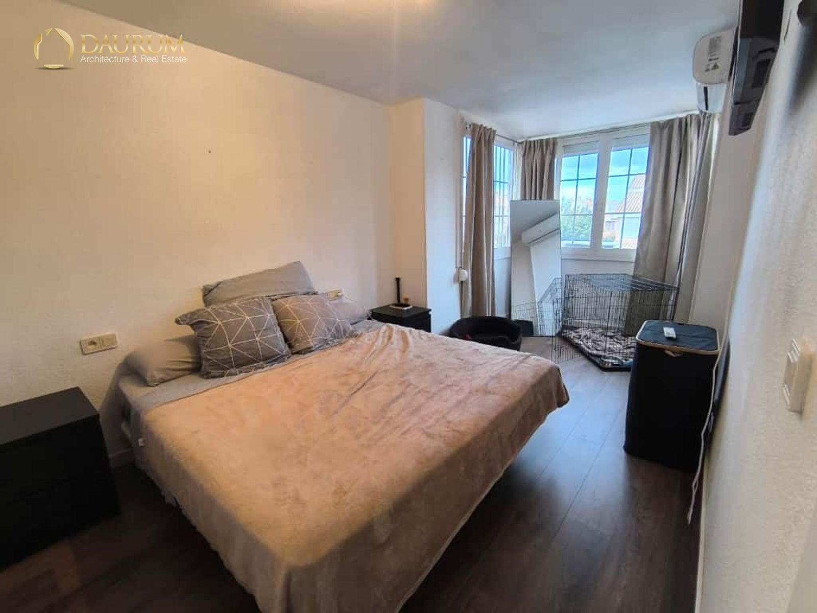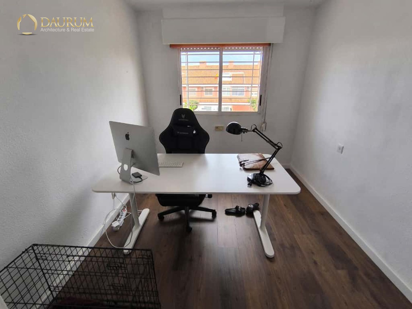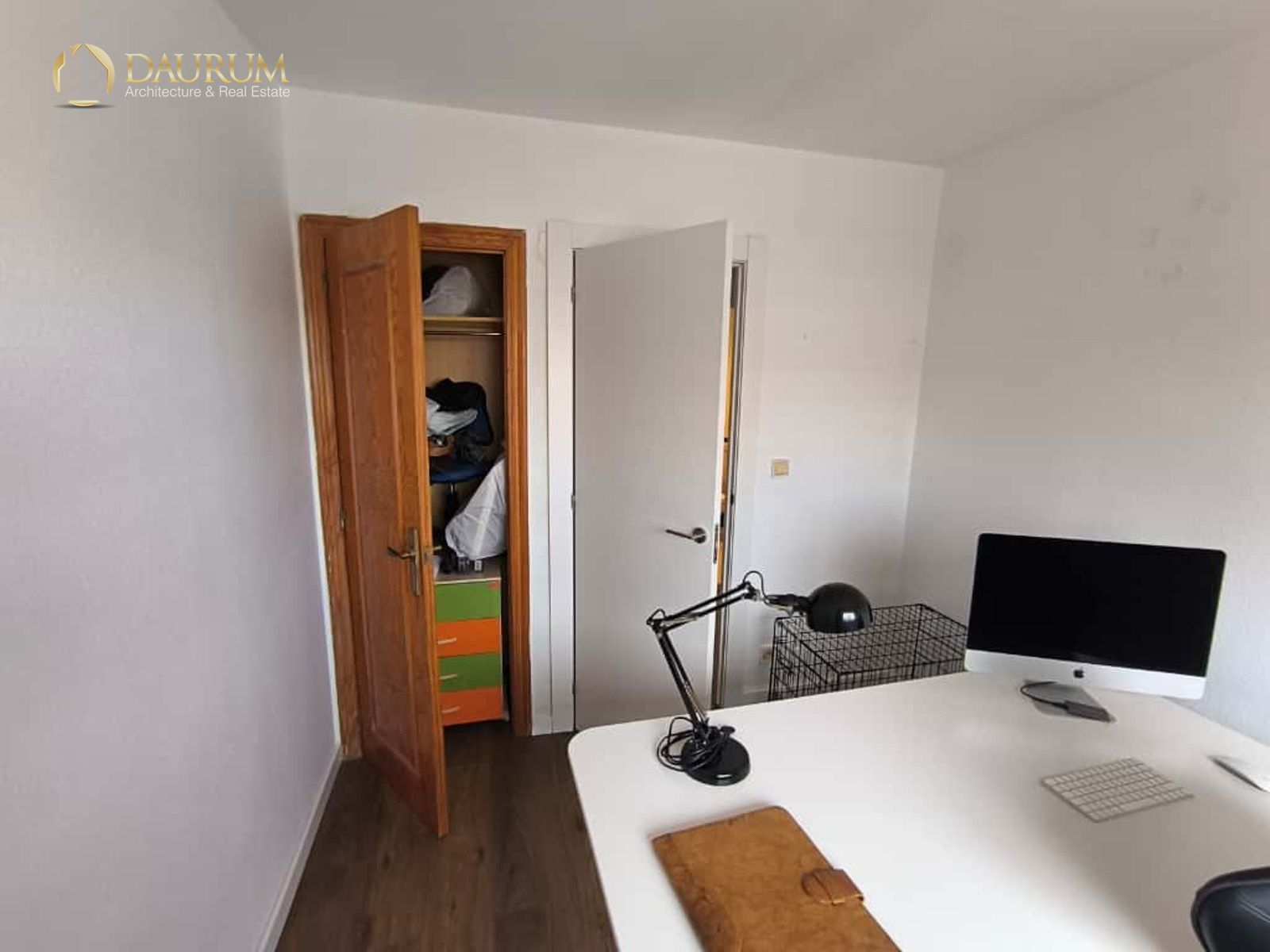 Ventanas de aluminio climalit, puertas lacadas en blanco, suelo de tarima madera y pintura tipo gotelé.