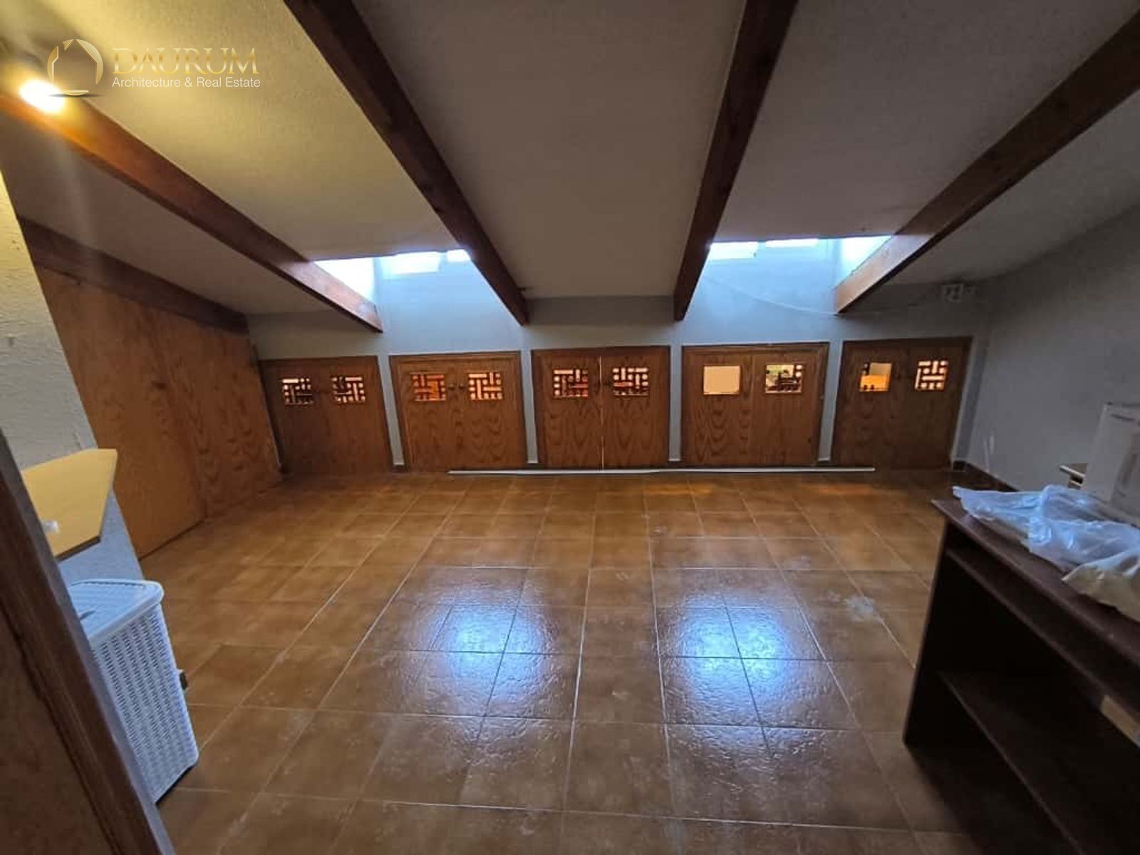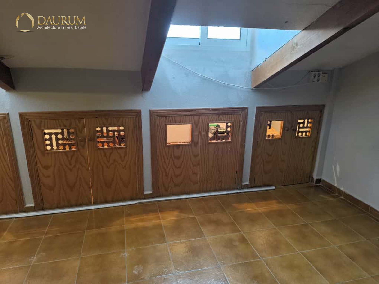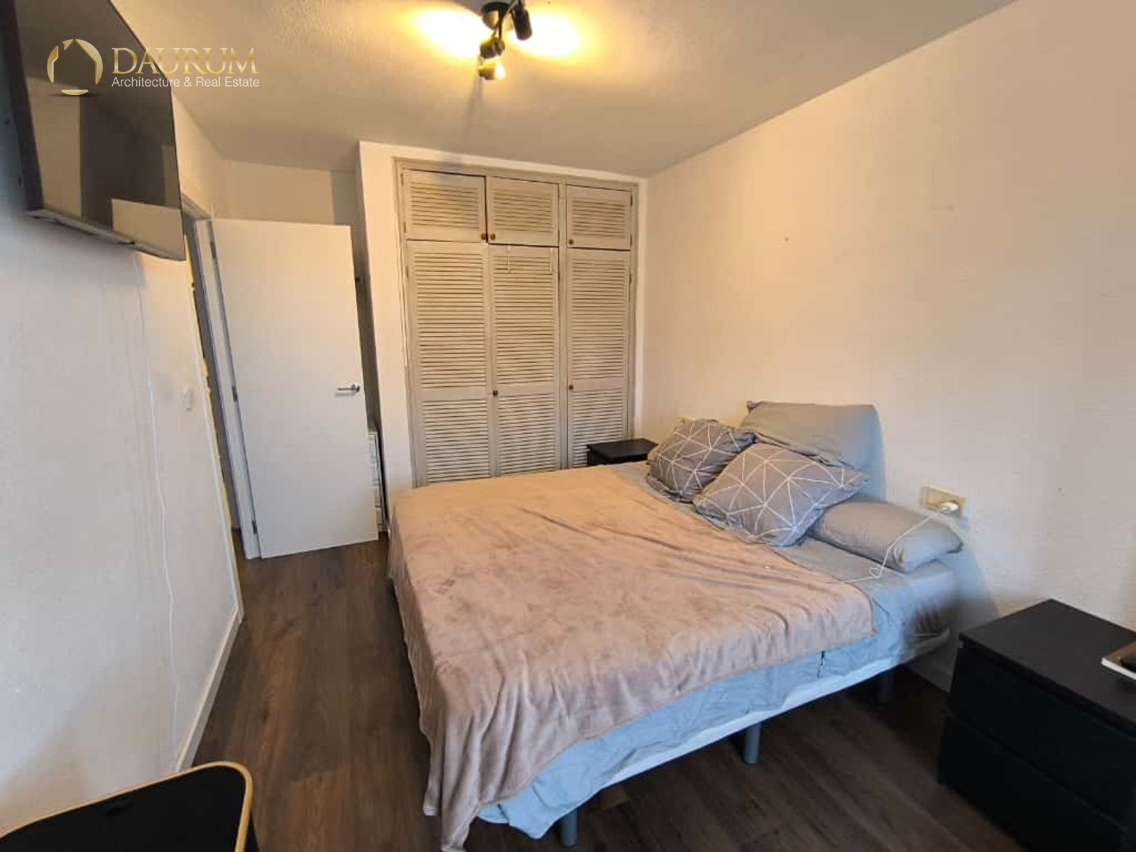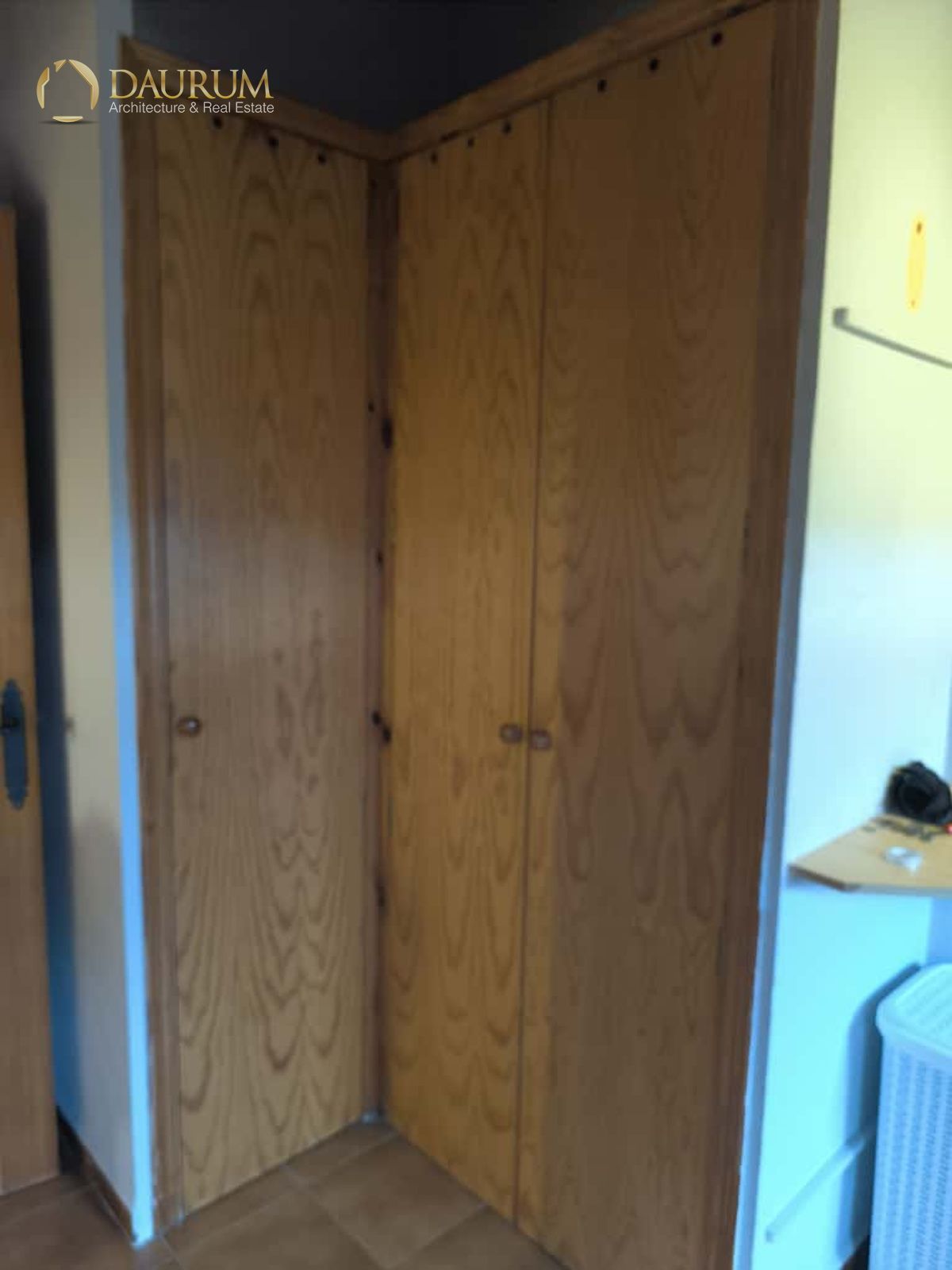 Ventanas de aluminio climalit, puertas lacadas en blanco, suelo de tarima madera y pintura tipo gotelé.